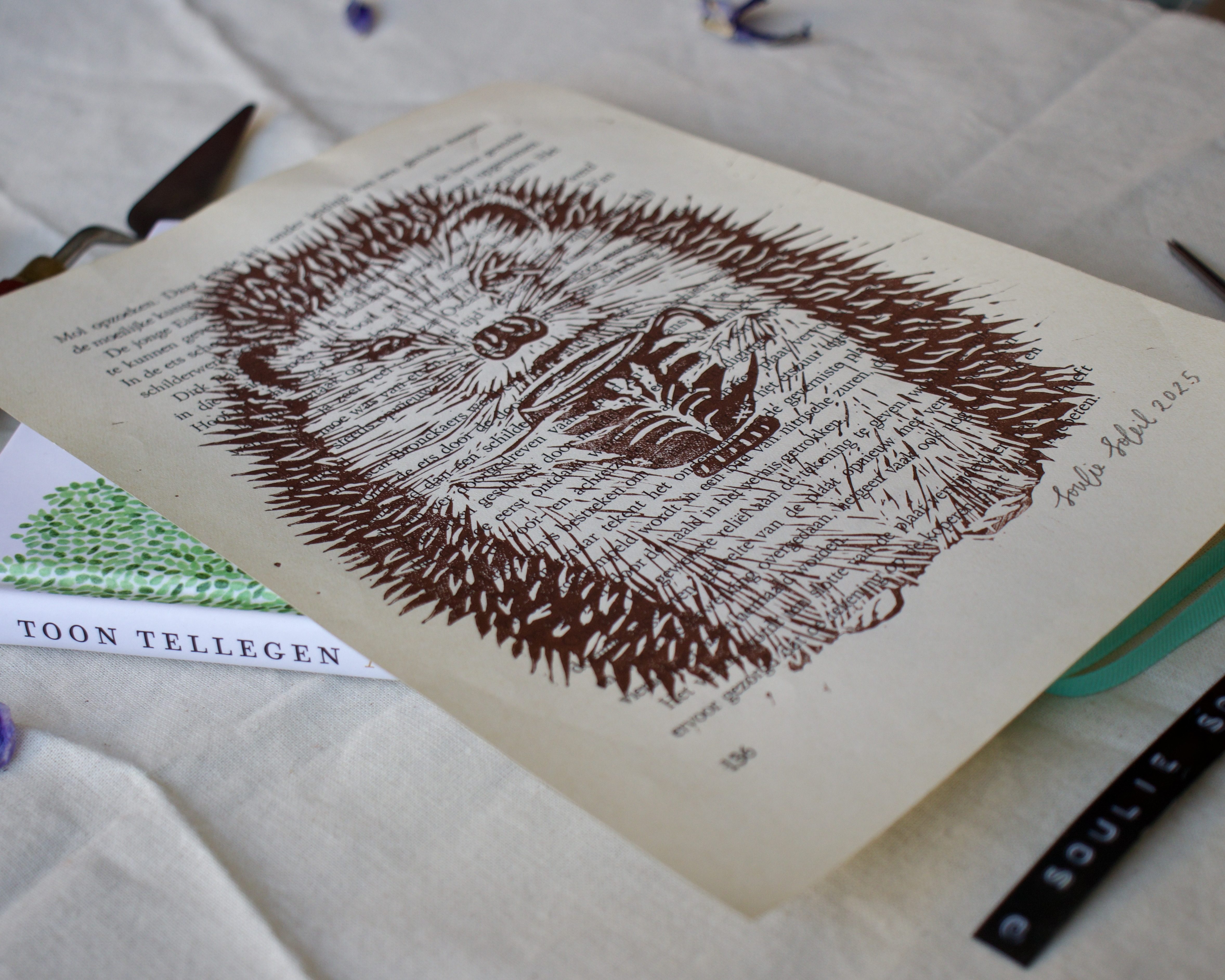 Handprinted A5 lino print, printed on the pages out of a vintage art book.