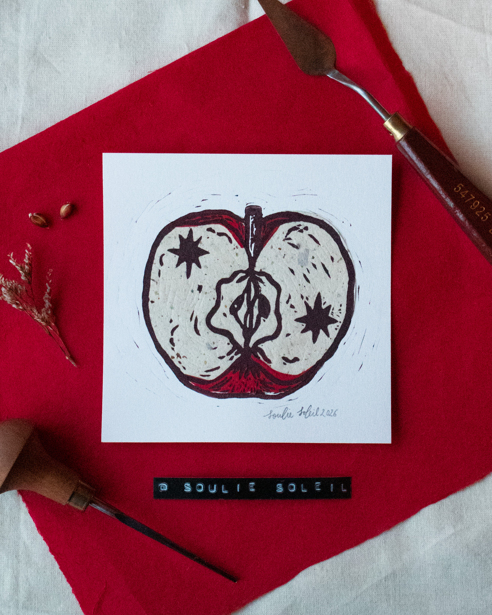 Handprintd small square lino print, made with chine-collé technique